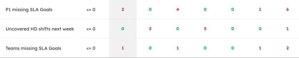 When thinking about a good week, one key was the simple idea of how well we managed tickets. We knew we were managing tickets well — good systems run by people who care — so as we dug a bit deeper and came to the realization the #1 issue with managing tickets well was being staffed appropriately. Instead of measuring last week’s SLA Goals, we adjusted the scorecard to look at the upcoming week’s schedule.